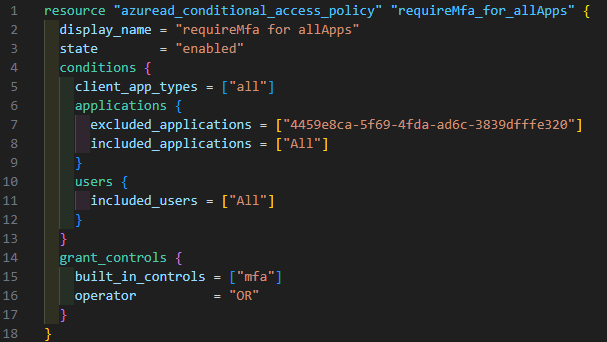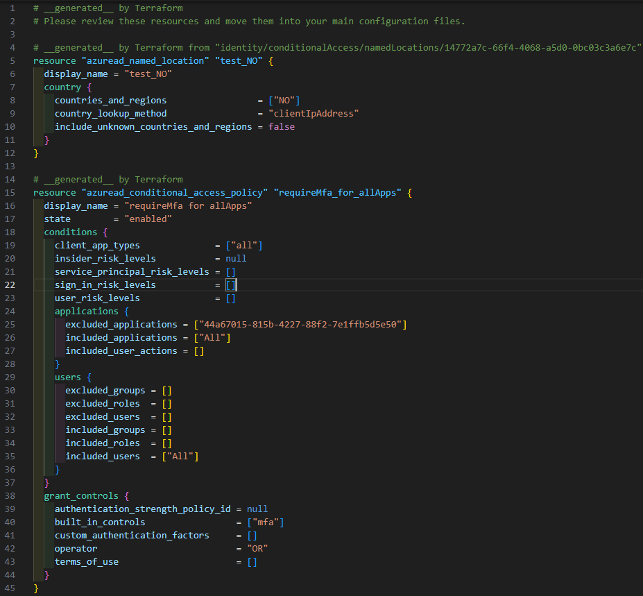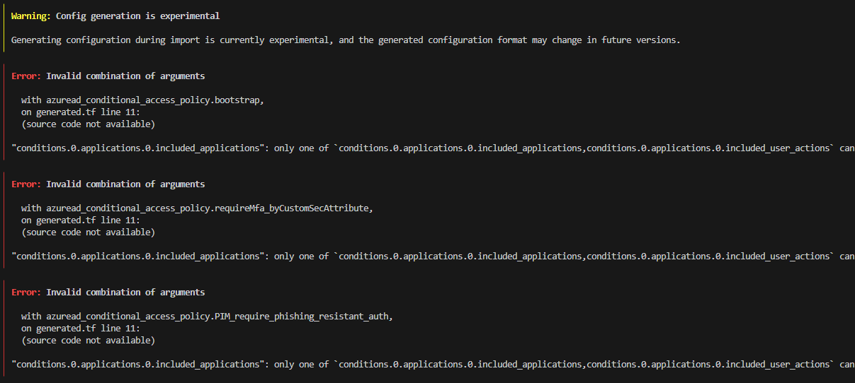 If you still encounter errors, you may need to resolve these manually, the ‘AzureAd’ Terraform provider is under development and new Conditional Access Policy features often lag behind.